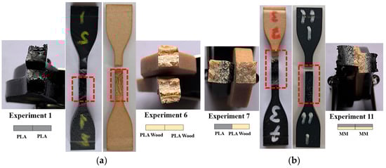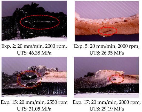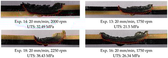In the rupture surfaces of experiment 11, experiment 14, and experiment 18 (Figure 11b,c) visual examinations revealed the presence of a material transition zone with a similar color. In the welded samples produced from multi-materials, the color change occurring at the interface between PLA and PLA Wood materials is distinctly visible. Additionally, experiment 14 and experiment 18 were produced as multi-material samples (with different material combinations), while experiment 7 samples were created using two different materials (PLA and PLA Wood). When comparing these test samples, it was found that using PLA Wood in combination with PLA (PLA–PLA Wood) is more advantageous than using PLA Wood alone (PLA Wood–PLA Wood). Specifically, having PLA positioned underneath contributes to increased weld strength. During mixing (the material movement caused by tool rotation), the material on the top is pushed outward due to the effects of plasticization, resulting in flash defects. Thus, a decrease occurs in the material located on the top of the weld area. Therefore, in the multi-materials where PLA Wood is positioned on top, it is thought that the PLA Wood flows out of the weld zone (resulting in flash formation), while the PLA remaining underneath contributes to increasing the joint strength. The higher UTS value of the PLA material compared to PLA Wood had a positive effect on welding strength. At the same time, the fact that there was no filler material in PLA as in PLA Wood also increased this effect.