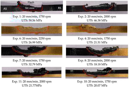 Figure 10 shows images of the weld area of the samples with the best and worst UTS according to the tensile test results. In Figure 10, a basin-shaped stir zone was formed towards the accumulation side in samples with flash defects [46]. While material flow occurred in all samples, irregularities were observed in those with lower UTS. It is understood that optimizing the FSW process parameters is necessary to eliminate these defects.
