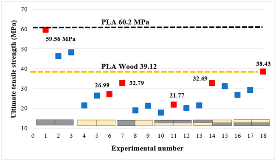 In the joining of multi-materials using FSW (experiments 10–18), it was observed that the weld strength varied depending on the material placement. In experiment 10, experiment 11, and experiment 12, the upper side of the multi-material was PLA, and the welding strength efficiency was limited to 34–42%. Since PLA was in the area where the shoulder contacted the part, flash formation occurred by flowing outwards during welding. Figure 12 shows the UTS values of the samples after FSW. The red dots on the graph show the highest tensile strength of each material group. In addition, the tensile strengths of the base materials (black line: PLA, orange line: PLA Wood) are added. When the mechanical properties of the base materials were examined, it was determined that the mechanical properties of PLA were better than those of PLA Wood. In their studies on the comparison of the mechanical and thermal conductivity properties of filament materials, Furkan et al. stated that the continuity of the layers was disrupted during printing due to the wood filler material and that the wood additive negatively affected the adhesion between the layers [40]. While the wood additive gives the filament a nice appearance and a wood smell during printing, it negatively affects the mechanical properties. When evaluating Figure 12, experiments 1, 2, and 3 should be taken into account according to the mechanical properties of PLA, and experiments 4–18 should be taken into account according to the mechanical properties of PLA Wood, since in welded joints, the part with the lowest strength determines the weld strength.