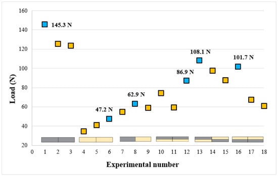 Bending test results of welded materials (Blue colors indicate the highest bending load value of each group).