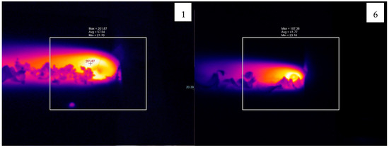 Figure 14 presents the thermal images taken for the highest weld strength obtained after FSW. During the FSW process, the temperature varied between 171.6 °C and 205.76 °C, depending on the tool rotational speed and the material pair. Table 5 shows the highest, lowest, and optimum temperatures recorded during welding (the temperature recorded at the best weld strength). The lowest temperatures recorded during the joining of PLA–PLA, PLA Wood–PLA Wood, and PLA–PLA Wood plates were 194.3 °C, 174.44 °C, and 171.6 °C, respectively, while the highest temperatures were 205.44 °C, 187.38 °C, and 194.16 °C, respectively.