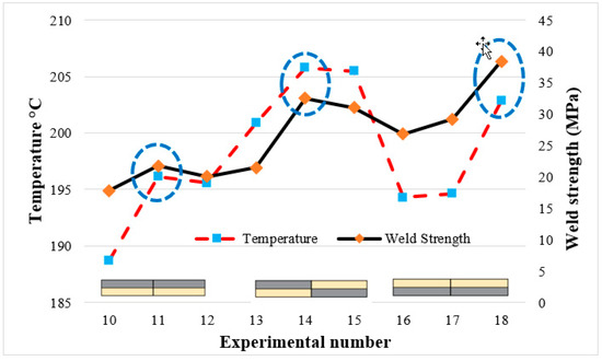 Figure 15 presents the temperature values and weld strengths observed during the joining of multi-materials using FSW. Unlike the combinations of PLA–PLA, PLA Wood–PLA Wood, and PLA–PLA Wood, it has been determined that the best weld quality in multi-materials was achieved at the highest temperatures.