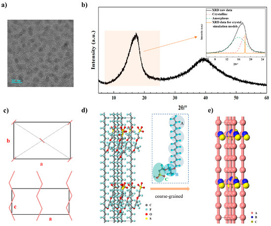 Characterization and modeling of the crystal structure. (a) HR-TEM and (b) XRD patterns of Nafion 117, and the inset shows the crystal and amorphous peaks of XRD, as well as the crystal peak of molecular modeling. (c) Schematic representative, (d) all-atom model, and (e) coarse-grained model of the crystal structure.