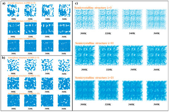 In contrast, the water distribution within amorphous regions showed no specific regular structure (Figure 2b). Water molecules were more randomly dispersed, lacking the organization seen in the crystal regions. Nevertheless, the semicrystalline structure, which contained both crystal and amorphous domains, exhibited a more ordered water distribution than the fully amorphous structure (Figure 2c). This was because the crystal regions helped to organize the water channels. Interestingly, temperature appeared to have a lesser impact on water distribution than hydration level, as the water molecules were primarily influenced by structural arrangements, rather than thermal fluctuations.