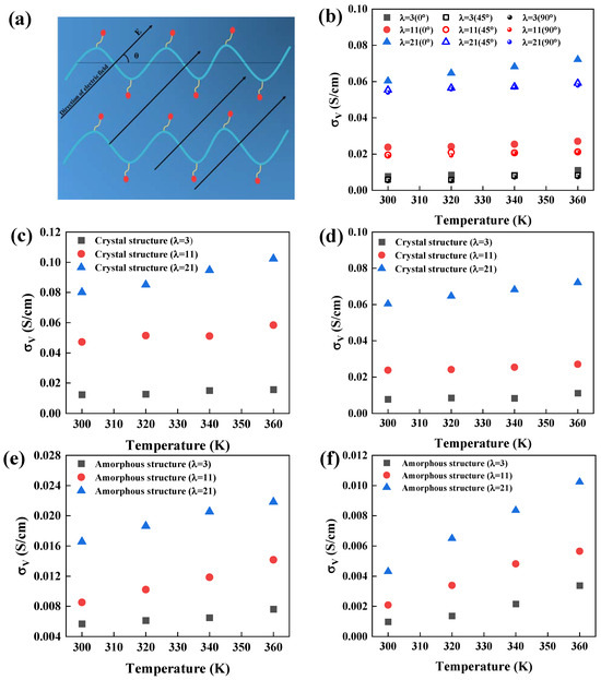 (a) Schematic of the direction of the electric field and the structure of the backbone chain arrangement. (b) Proton conductivity in different electric field directions. (c–f) Proton conductivity in crystal and amorphous structures from AAMD and eDPD simulations.