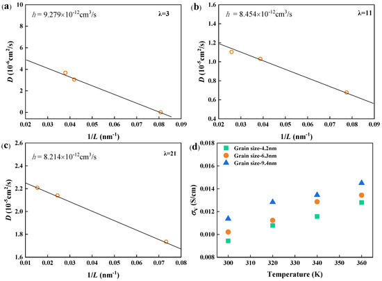 Proton diffusion coefficients of semicrystalline structures as a function of 1/L at (a) λ = 3, (b) λ = 11, and (c) λ = 21. (d) Proton conductivity in the same semicrystalline structure with different grain sizes.