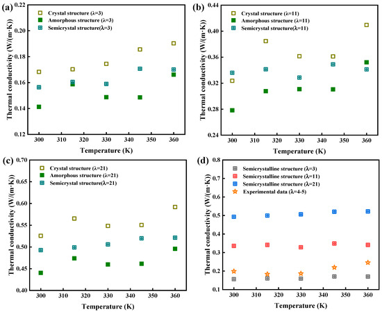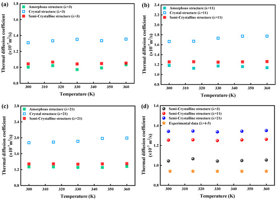 Thermal diffusion coefficient of crystal, amorphous and semicrystalline structures at (a) λ = 3, (b) λ = 11, and (c) λ = 21. (d) Comparison of simulation and experimental results.