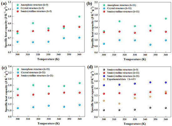 Specific heat capacity of crystal, amorphous, and semicrystalline structures at (a) λ = 3, (b) λ = 11, and (c) λ = 21. (d) Comparison of simulation and experimental results.