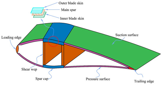 The most important part of producing wind energy is the wind turbine blade, whose production costs make up roughly 23% of the unit cost [1]. The majority of wind farms are situated in isolated locations, making maintenance and monitoring of the turbines challenging. Inaccurate assessments made too late could result in catastrophic damage to wind turbine blades under demanding operating conditions, catastrophic accidents, and enormous financial losses. The profile structure of large wind turbine blades is depicted in Figure 1, and more than 90% of the components of wind turbine blades are composed of composite materials [2].