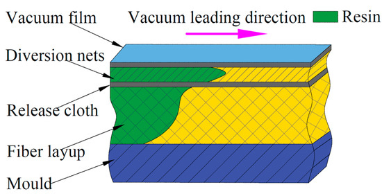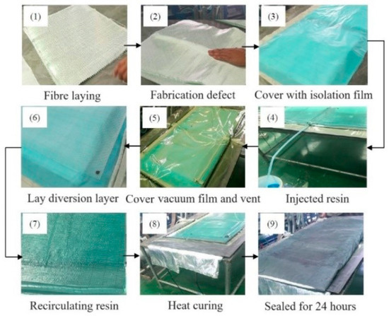 Vacuum-Assisted Resin Infusion (VARI) was used to make laminates with defective blades. The technique was Resin Transfer Molding (RTM), which is a high-performance and low-cost vacuum-assisted perfusion method developed on the basis of RTM [26]. At present, VARI has become one of the main manufacturing processes for wind power blades, and the manufacturing method is shown in Figure 3. Under the same process conditions, the strength, stiffness, hardness, and other physical properties of the parts obtained by the vacuum perfusion method will be increased by 30–50% compared with the traditional hand paste process, and the porosity can be reduced to less than 0.2%, and the cost can be saved by 50%. In addition, compared with the traditional resin molding method, the vacuum perfusion method can reduce the porosity of composite parts and save 50–70% of the mold cost [27].
