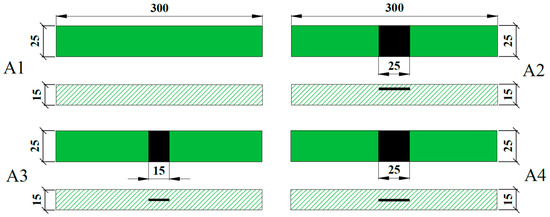 After the inspection is qualified, the grease is injected and finally the curing operation is carried out. The schematic material samples of the four combinations are shown in Figure 5. Specimen A1 has no delamination defect and specimen A2 has PTFE film with a size of 25 mm × 25 mm sandwiched between the third and fourth layers. The PTFE films are 25 mm × 15 mm and 25 mm × 25 mm in size, respectively, sandwiched between the 12th and 13th layers of specimens A3 and A4.