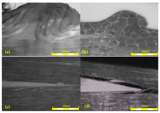 The microscopic morphology of the resin aggregation layer with artificial prefabricated wrinkle defects is shown in Figure 7a. It can be seen that the boundary between the resin aggregation area of artificial wrinkle defects and the composite material forms an “Arched” transition zone. The change in the fiber layering angle in this region makes the composite susceptible to stress concentration interference during loading. As shown in Figure 7b after the natural wrinkle defect is polished, the fiber structure near the boundary of the resin gathering area changes, which is consistent with the interface structure at the artificial prefabricated wrinkle defect. In Figure 7c, it can be seen that the fibers near the layered interface at the macro level do not fully fuse with the resin matrix due to the presence of the PTFE film. Natural stratification easily weakens the adhesion of the material interface, resulting in the destruction of the interface structure, and its microscopic morphology is shown in Figure 7d. By comparing the defect morphology of artificial lamination and natural lamination, it can be seen that the artificial lamination defect composite method adopted in this paper can simulate the natural lamination defect better.