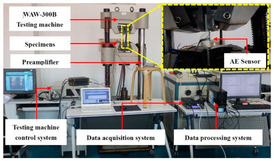 The tensile tests of composites were performed according to the ASTM standard D3039 partly (Standard Test Method for tensile properties of Ploymer Matrix Composite Materials) [28]. The tensile test was carried out on a WAW-300B servo universal test machine. The maximum test force is 300 kN, the relative error of the test force indication value is ≤±1% of the value, and the test force measurement range is 2~100% of the maximum test force. The control range of constant displacement is 0.01 mm/s, and the test system is shown in Figure 8. An acoustic emission sensor was installed at the defect of the specimen and fixed with tape. In order to provide a good acoustic coupling between the specimen surface and the sensor, silicone grease was used as the coupling agent and a pencil fracture test was performed. In order to ensure the effective elimination of electrical and mechanical noise, the appropriate threshold is fixed at 40 dB through repeated testing. The initial load is applied to eliminate the noise interference in the loading process of the reinforced aluminum sheet.
