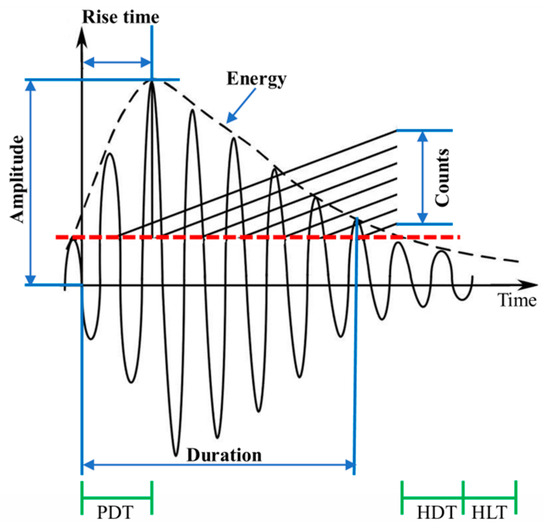 It is worth noting that the quality of acoustic emission data obtained by the experiment mainly depends on the timing parameters of the time-domain waveform. The PDT (peak definition time), HDT (hit definition time), and HLT (hit lock time) are parameters used to select acoustic emission event characteristics. The main acoustic emission parameters and definition methods obtained in the experiment are shown in Figure 9. In the experiment, the center frequency of the acoustic emission sensor is 150 kHz and the gain of the preamplifier is 40 dB. The sampling frequency is set to 3 MHz, the peak definition time is 30 μs, the peak definition time is 150 μs, the hit definition time is 150 μs, and the hit lock time is 300 μs [29].
