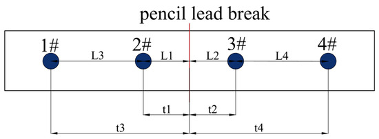 The sensor selects four symmetrical sensor channels, and the position of the sound source is the real lead break position, that is, the red line position, as shown in Figure 10. Through the arrival time of the acoustic emission signal received by the sensor and the distance of the sensor ruler, the calibration of the acoustic emission wave speed is completed. Considering the complex structure of the composite material itself, the acoustic velocity calibration of the acoustic emission signal needs to be measured several times, and the average value is taken. In order to solve the attenuation problem of acoustic emission signals, the sensor signals at different positions are tested during the lead-breaking test. The amplitude of the lead-breaking signal collected by the sensor should not be less than two times of the threshold amplitude. Due to the close distance between the acoustic emission sensor and the defect position in this paper, the attenuation effect of the acoustic emission signal is relatively small. The sound velocity calculation method is shown in Equation (1).