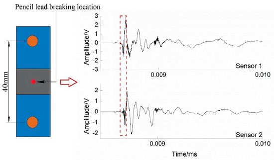 An acoustic emission lead-breaking waveform is shown in Figure 11. As can be seen from the figure, the time difference between sensor 1 and sensor 2 to receive the acoustic emission signal of broken lead is 0.0018 ms (<Δtmax = 0.0084 ms). The test results show that both sensors can effectively receive acoustic emission signals, and there is no significant difference in signal attenuation. Therefore, the use of an acoustic emission sensor in the experiment can also effectively capture the damage characteristics, which is consistent with the experimental conclusion of Favretto [30].