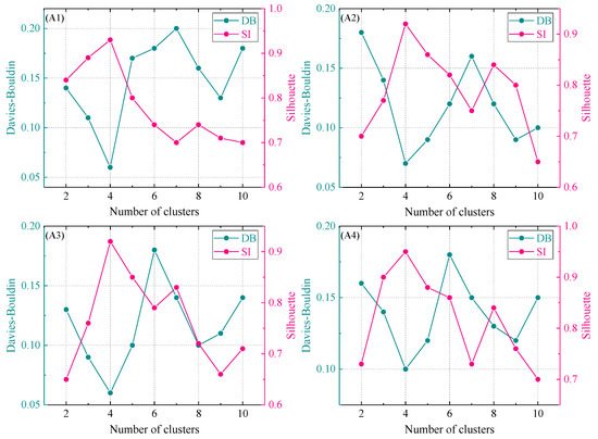 Reference [34] compared the clustering sensitivity of different acoustic emission parameters. The results show that the acoustic emission amplitude, average frequency, and energy have high variance values, which means that these three acoustic emission parameters will obtain better clustering results. The clustering number results of composite specimens are shown in Figure 13. It can be seen from the evaluation results of the DB and SI index that the optimal cluster number is 4.