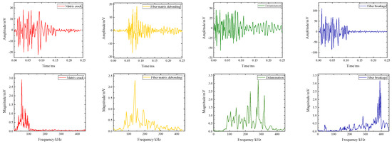 As shown in Figure 14, acoustic emission waveforms and spectrum characteristics of different damage modes were extracted according to the clustering results. The damage characteristic spectrum of real wind turbine blades and the acoustic emission waveform characteristics of glass/epoxy composites were compared. By comparing the damage pattern recognition results of the reference and this paper, the characteristic frequency range of the four damage patterns is basically consistent with the reference results. The time-domain waveform duration of high-frequency signals is shorter, and the time-domain waveform duration of low-frequency signals is longer [35,36,37]. It is worth noting that the acoustic emission signals of matrix cracks in real wind turbine blades in reference [36] are compared. In this paper, the acoustic emission signal amplitude representing the low-frequency matrix crack fluctuates greatly, as shown in Table 1. The reason for this phenomenon is that in the damage process, the matrix usually starts with small cracks and gradually expands into larger cracks, which leads to obvious amplitude fluctuation. In addition, due to the influence of defects, the matrix structure is more likely to produce high-amplitude acoustic emission characteristics during the damage process.