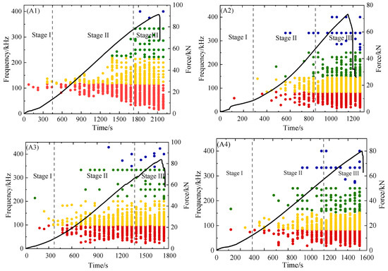 According to the results of clustering in Table 1, AE signals of fiber bundle breakage are characterized by peak frequency and low amplitude, and samples with delamination defects generate AE signals of peak frequency earlier than standard specimens. In the second stage of damage evolution, fiber/matrix stripping and propagation lead to the continuous emergence of high-frequency AE signals. For sample A1 shown in Figure 15 (A1), AE signals with high-frequency fiber breakage began to appear when the load was increased to about 80 kN. Similarly, for specimens A2, A3, and A4 with delamination defects in Figure 15 (A2–A4) with AE characteristics of high-frequency fiber breakage, the corresponding loads were 45 kN, 75 kN, and 55 kN, respectively. Compared with specimens A1, A3, and A4, the high-frequency fiber breakage feature of specimen A2 appears at about 550 s, which is earlier than the peak frequency and irreversible damage time of other specimens. This is because the closer the lamination defect is to the surface of the specimen, the lower the structural bearing capacity of the specimen.