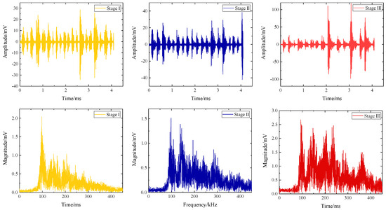 As shown in Figure 16, the peak frequency of acoustic emission signals in damage stage I is 93 kHz, and the frequency components in this stage are mainly low-frequency characteristics, and there are almost no high-frequency fiber breakage components larger than 350 kHz. In stage II, the acoustic emission peak frequency is mainly 93 kHz, 150 kHz, and 210 kHz, and there is a frequency characteristic of 290 kHz. In this stage, the main damage is matrix cracking, fiber breakage, and interface delamination. In stage III, in addition to the low and medium frequency features, a high-frequency feature with a peak frequency of 378 kHz appears, indicating that the damage component of fiber breakage is very active in this stage. The spectrum characteristics of the above transmitted signals are basically consistent with the clustering results in Figure 15 (A1).