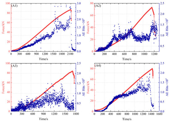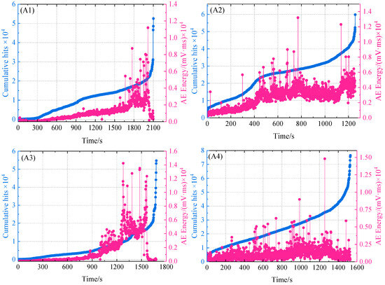 AE accumulation energy and accumulation count distribution over time: specimens A1, A2, A3, and A4.