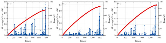 As can be seen from Figure 18, the overall trend of acoustic emission energy increases with the increase in load. At the early stage of loading, the internal damage of the composite material has no obvious change, and the acoustic emission energy is relatively low. However, with the increase in load, the AE energy shows a gradually increasing trend, which indicates that the damage accumulation and evolution inside the composite material frequently release high-energy characteristics. When the fracture failure load is reached, the instability failure occurs inside the composite structure, and the variation trend of acoustic emission energy reaches a peak.