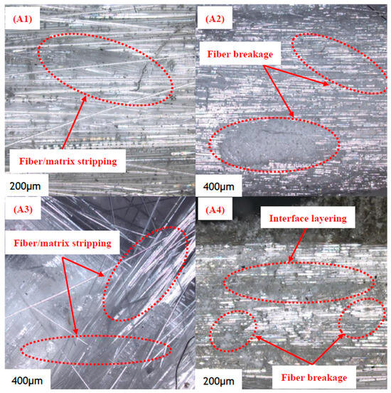 The metallographic microscope of the fracture position of the layered defect specimen is shown in Figure 22. The damage mode and failure form of the sample can be clearly observed through a scanning electron microscope. Figure 22(A1) shows the fracture micromorphology of specimen A1, from which fiber stripping and fracture can be clearly seen. Because A1 is a no-defect specimen, the fiber inside the structure has high bonding strength with the matrix, and the stress is evenly distributed along the fiber direction under the action of load. Therefore, there is no obvious bending deformation of glass fiber after sample A1 fracture. Figure 22(A2) is the microtopography of the fracture of the A2 specimen, from which it can be observed that a large area of fiber breakage failure is observed, and some fibers are not sufficiently bonded to the matrix, resulting in the fracture of nearby fibers. Furthermore, a large number of fiber breakages distribute a portion of the load to the adjacent fibers, causing an unequal distribution of stress, as indicated by the random distribution of fiber breakages. Figure 22(A3) shows the fracture micromorphology of the A3 specimen. The fibers separate from the matrix as a result of the interface between the local fibers and the matrix breaking. Due to the existence of delamination defects, the strength of the interlayer structure is reduced, and numerous fibers are pushed out when the matrix’s adherence to the fiber disintegrates. Figure 22(A4) shows the fracture microstructure of A4. Due to the large size of the delamination defect of this specimen, the bearing capacity of the fiber and the binding effect between the fiber and the matrix are the primary determinants of the internal stress distribution of the material under load. The stretching of the fiber bundle itself is primarily responsible for the distortion of the fiber when it starts to experience stress. However, the fiber bundle and matrix will slip and dislocate when the external force is raised further, resulting in severe fiber deformation. At this point, the material structure’s bearing capacity significantly decreases due to large-area fiber breakage and interface delamination, ultimately leading to failure.