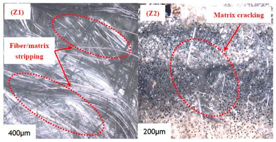 The metallographic microscope of the fracture position of the wrinkle defect specimen in the experimental results is shown in Figure 23. Different from the layered defects, the fibers are bent at a certain angle due to the existence of wrinkle defects, and the fibers are scattered and accompanied by distortion after the specimen is broken. Fiber breakage occurs at the interlayer of the coated fiber, and interface debonding occurs as a result of the debonding and sliding between the fiber and the matrix, as shown in Figure 23(Z1). Considering the mechanical characteristics of wrinkle defects, the rich resin region needs to bear a combination of axial tensile, compressive, and bending loads under the action of loads [41]. Therefore, it can be seen from Figure 23(Z2) that matrix cracks are more likely to accumulate in the rich resin region of wrinkle defects, and the stress concentration of fiber bedding bending is more likely to lead to interlayer cracking damage.