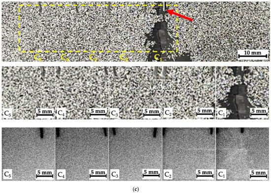For the reason of high spatial resolution, as well as penetration ability, X-ray radiography is one of the most effective approaches to monitoring structural integrity and detecting discontinuities [24], including inverse Compton scattering [25]. In addition, scanning with angular cone beams [26] enables the obtainment of data close to tomographic results [27]. The use of X-ray computed tomography (CT) [28,29,30] and μCT [31,32,33,34] opens up broad prospects in terms of identifying and quantitatively characterizing the internal structure, manufacturing defects, and operational damage in CFRPs. However, these methods are quite difficult to use for NTD of extended structures, particularly with limited access.