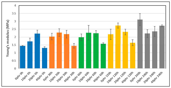 As can be seen in Figure 1, Young’s modulus (YM) follows an increasing trend as a function of the exposure time to thermo-oxidative aging. Likewise, it can also be observed that for the same exposure time, the trends change as a function of the dGTR content of the samples. Some of the samples with an exposure time of 120 h, have YM values that show increases of 140%. This is due to two phenomena, namely the formation of crosslinks in the thermo-oxidated elastomeric chains and the generation of hard and brittle layers around the particles, as has been reported in previous studies [25,26,27].