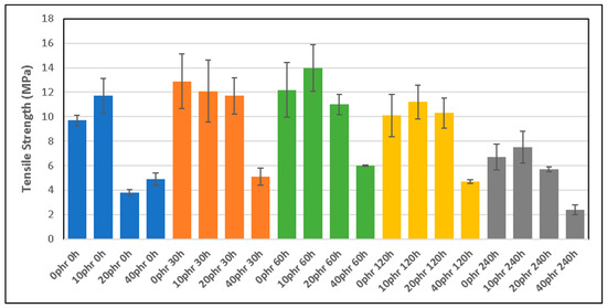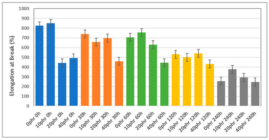 The elongation at break (EB) as a function of the aging time (Figure 3) follows a fairly defined decreasing trend. Higher EB values are observed for the samples with 0 and 10 phr dGTR, up to an exposure time of 60 h. Between 120 and 240 h, the decrease in the elongation at break is significant. In samples with 20 and 40 phr dGTR, a marked decrease is also observed, mainly for the non-aged samples. The behavior at the EB is also explained by the same phenomena discussed previously.