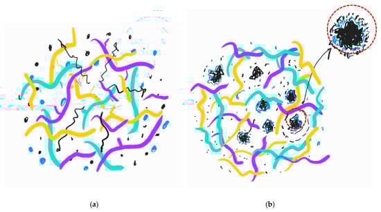 Figure 4. Proposal squema showing the phenomenon of CB and SiO2 migration from the core to the surface in: (a) the NR/SBR/NBR composite without dGTR and (b) composites with dGTR. Blue strands correspond to SBR, yellow strands to NR, lilac strands to NBR, black dots to CB, and blue dots to SIO2. The enlarged red circle shows the SiO2 evolved dGTR particle that prevents CB exudation, generating a brittle layer of CB.