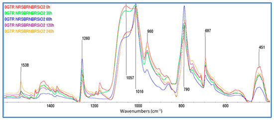 As can be observed in the spectra in Figure 5, the most interesting bands to be analyzed are those corresponding to SiO2 at 1057 cm−1 and carbon black (CB) at 1016 cm−1. The samples without dGTR present an intense band corresponding to SiO2 in the unaged samples. The band assigned to CB at 1016 cm−1 is intense and is not altered by the degradation time. As mentioned in regard to the measurements, the spectra were recorded by ATR spectroscopy and, as such, are representative of the surface of the samples. The difference in the variations in the intensity of those two bands is then related to the diffusion phenomena. The band assigned to CB remains at a high and constant intensity because the nanometric size of this filler gives it a high capacity to diffuse through elastomeric structures in order to reach the surface; the amount of CB observed in the spectra is not altered by the degradation time. Instead, the SiO2 crystals, originally dispersed within the elastomeric matrix, diffuse towards the surface with a longer degradation time. After 60 h, the elastomeric structures of NR (which are less stable than those of SBR and NBR) [29] begin to degrade, generating a greater number of branches, oxidation groups, and crosslinks. These structural changes, together with the abovementioned effect of TESPT attaching, prevent greater diffusion of SiO2 towards the surface, which is observed with a lower band intensity.
