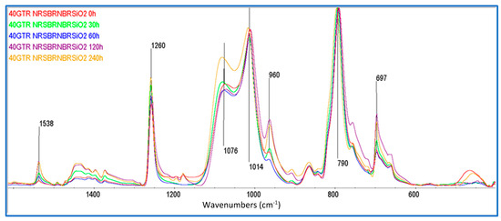 Figure 6. FTIR spectra of dGTR/NR/SBR/NBR/SiO2 compounds filled with 40 phr of dGTR as a function of different thermo-oxidation exposure times (0, 30, 60, 120, and 240 h). Y axis in arbitrary units.