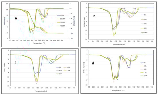 Figure 7b–d illustrates the DTGA curves of the 0, 20, and 40 phr dGTR thermo-oxidated compounds, revealing three distinct peaks. As previously mentioned, the first peak corresponds to NR, the second to the SBR–NBR domain, and the third to the TdT of carbon black (CB). The thermo-oxidation process significantly modifies these peaks, with the samples containing lower dGTR content (0 and 20 phr) being more affected than those with 40 phr (Figure 7d). This is because thermo-oxidation at 80 °C is more effective for samples with a higher raw elastomer content (NR, SBR, and NBR), compared to those with greater dGTR content.