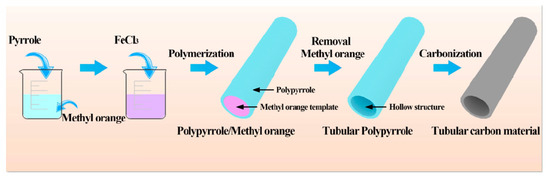 The fabrication procedure illustration for nitrogen-doped porous tubular carbon material is depicted in Figure 1 Initially, during the dispersion of methyl orange in the water, methyl orange molecules would self-assemble to form one-dimensional microrods micelles according to the reported literature [36,37]. The methyl orange serves as an initiator and a hard template for the polymerization of pyrrole monomer. Subsequently, the pyrrole monomer polymerized on the surface of one-dimensional methyl orange microrods. After removing the methyl orange, polypyrrole nanotubes can be obtained. Finally, the nitrogen-doped tubular carbon materials were prepared after the carbonating process of polypyrrole nanotubes.