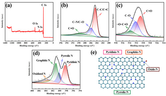 (a) XPS element full spectrum of tubular carbon material. Regional XPS spectra of (b) C 1s, (c) O 1s and (d) N 1s. (e) Structural illustration for nitrogen-doped carbon materials.