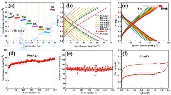 The coulombic efficiency (CE) of the tubular carbon material is presented in Figure 5e. The initial coulombic efficiency recorded was 96.7%, while the efficiency of the second cycle increased significantly to ~100%. Over cycles 2 to 300, the average CE of the material reached 99.7%, indicating that the material demonstrates good reversibility and repeatability [45]. Figure 5f presents the CV curve of the aluminum-carbon storage system, collected at a test rate of 0.1 mV s−1 within an operating scope of 0.2 to 1.6 V. Within this voltage range, the CV curve does not exhibit distinct oxidation and reduction peaks; rather, it displays a quasi-rectangular shape, characteristic of typical capacitive response behavior. This observation suggests that the carbon material primarily contributes to capacity through its capacitive properties. Furthermore, the symmetrical trend observed in the CV curve indicates that the battery undergoes reversible ion insertion and extraction reactions. Because aluminum chloride is an acidic salt solution and the pH value of 1.0 mol L−1 AlCl3 of aqueous solution is about 1.3, the cations in electrolyte contain Al3+ and H+ [46]. Therefore, according to the reported literature, Al3+ and H+ may undergo co-insertion and de-insertion on tubular carbon materials during charge and discharge processes [47].