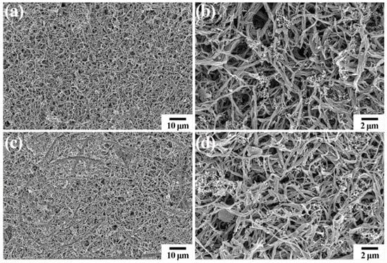 In order to demonstrate the structural stability of nitrogen-doped tubular carbon electrodes, the surface morphology of the nitrogen-doped tubular carbon cathodes at a fresh state and after a rate capability test are shown in Figure 6. Figure 6a exhibits the low magnification SEM image of a fresh electrode, where the overall surface morphology of the electrode is uniform with a porous structure, and no aggregates can be found. Furthermore, the high magnification SEM image of a fresh electrode in Figure 6b clearly displays the even dispersion of nitrogen-doped tubular carbon materials. The tubular structure of active carbon materials is hardly destroyed during electrode preparation. Figure 6c,d shows the SEM images of the electrode after a rate capability test and it presents denser surface morphology in contrast to the fresh electrode, which may be due to the volumetric change of tubular carbon materials during cycling. Notably, the morphology and structure of tubular carbon materials show no significant damage compared to that of materials in the fresh electrode, indicating the stable construction during the charging and discharging processes.