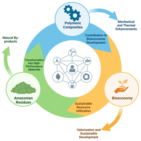 The interconnected relationship between these diverse agro-extractivism activities and the development of PCs can be visually represented through the conceptual model depicted in Figure 1. This model illustrates how Amazonian residues, such as those from Brazil nuts, açaí, and other natural products, can be integrated into polymeric matrices to produce high-performance materials. In turn, these composites contribute to a broader bioeconomy by offering sustainable and economically valuable alternatives to traditional materials. The central portion of Figure 1 illustrates the interconnectedness of key elements involved in the development of PCs using Amazonian residues. At the core, the human figure symbolizes the role of human activities, such as research, innovation, and development, in the sustainable use of natural by-products. The icons surrounding this central figure represent various critical components: chemical processes (molecular structure icon), sustainable waste management (recycling icon), valorization of natural resources (leaf icon), and transformation of these resources into high-performance materials (plant growth icon). These interconnected elements emphasize the cyclical relationship between agro-extractivism, material development, and bioeconomic advancement.