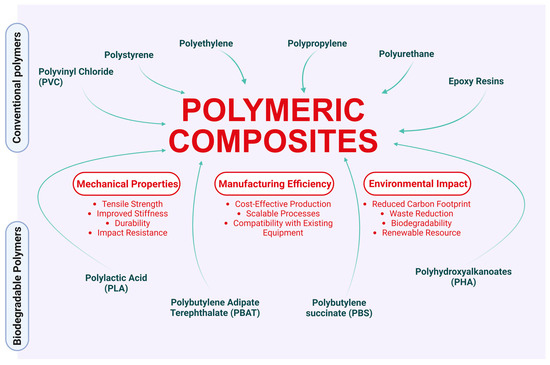 Figure 2 illustrates how conventional and biodegradable polymers contribute to the formation of PCs, highlighting the impact of different types of polymers on the mechanical properties, manufacturing efficiency, and environmental impact of the composites. Conventional polymers, including PP, PE, and epoxy resins, are often selected for their durability, robustness, and cost-effectiveness in various industrial applications. However, with the increasing demand for sustainable materials, biodegradable alternatives such as polylactic acid (PLA) and PBAT have become attractive because of their ability to degrade under specific environmental conditions [105]. Studies have shown that PP and PE can decompose in landfills over hundreds of years. For instance, PP exhibits high resistance to degradation, and even after five years in a landfill, it only shows initial signs of deterioration, such as the formation of microplastics and biofilms of microorganisms on the material surface [106]. In terms of the environmental impact, the production of 1 kg of PP emits approximately 1.58 kg of CO2 equivalent, highlighting a considerable carbon footprint [107]. These factors underscore the complexity of managing conventional plastic waste.