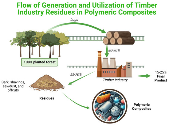 Figure 3 illustrates the industrial wood-processing chain, where only 15–25% of the original volume of processed logs results in a final product, while the remainder is converted into waste such as bark, shavings, sawdust, and offcuts [172]. These residues, which would normally be discarded, can be reintegrated into the production chain by incorporating them into polymer matrices, adding value by transforming by-products into useful materials for the fabrication of PCs.