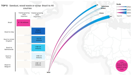 As illustrated in Figure 4, which presents the main export and import routes of sawdust and wood residues from Brazil in 2022, several countries stand out for their significant growth in this trade. According to COMTRADE (United Nations Commodity Trade Statistics Database) [177], Brazil plays a substantial role in the global trade of sawdust and wood residues, contributing approximately 1.5% to this market, translating to a total trade flow of USD 118 million. These residues are directed to multiple destinations, with the top five importing countries demonstrating significant demand. The leading importing country is Italy, with a substantial value of USD 68.8 million. The United Kingdom follows with imports valued at USD 37.6 million, reflecting a strong demand for wood residues. In third place, the Netherlands imports USD 5.6 million, highlighting the diversity of the European market. France, in fourth place, acquires USD 2.5 million, representing a significant fraction of the trade, while Belgium, in fifth place, imports USD 1.6 million, contributing to the commercial dynamics in the region.