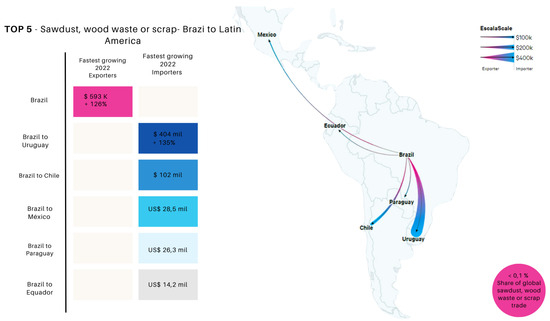 When analyzing the trade flows of Brazilian exports to Latin America (Figure 5), it is observed that Brazil also exports wood residues to neighboring countries. The following data illustrate this dynamic within the top five countries: Uruguay imported USD 404,000 worth of wood residues, showing a notable growth of 135% from 2017 to 2022. Brazil, with a share of less than 0.1% in the global trade of sawdust and wood residues, registered a total export value of USD 593,000, evidencing a growth of 126% over the same period. The top five importing countries of these products were Chile, with an import value of USD 102,000, indicating a developing potential market; Mexico, in third place, with USD 28,500; Paraguay, in fourth place, with USD 26,300; and Ecuador, in fifth place, with USD 14,200 worth of sawdust and wood residues [177]. However, while Brazil is exporting wood residues, such as sawdust, at significant values, there is untapped potential to add even more value to these residues. Instead of merely exporting the raw material, these residues could be utilized domestically to produce high value-added products, such as advanced polymeric composites. This would not only increase the economic value generated from these residues but also contribute to the development of a more sustainable and circular economy in the AR.