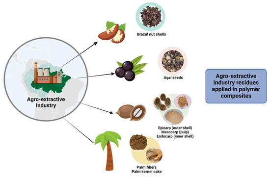 Agro-extractivism industry residues applied in polymer composites: Examples include Brazil nut shells, açaí seeds, babassu coconut components (epicarp, mesocarp, and endocarp), palm fibers, and palm kernel cake.