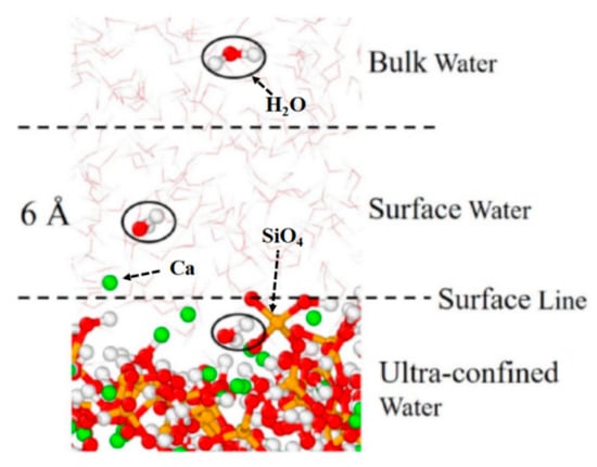 Water molecules in C-S-H gels are categorized based on the location of oxygen atoms: interlayer water molecules, surface water molecules, and capillary water molecules. Interlayer water molecules are located within the C-S-H gel matrix, surface water molecules are within 6 Å of the outer surface of the matrix, and capillary water molecules are outside the C-S-H gels (Figure 2) []. Compared to capillary water, surface and interlayer water molecules exhibit more ordered structures, higher densities, greater orientational mobility, and lower diffusion coefficients [].