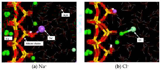 Local structures of (a) sodium ions and (b) chloride ions adsorbed on the C-S-H substrate [].