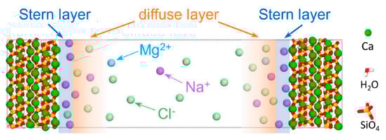 Ca2+ in C-S-H gel includes both surface Ca2+ and constrained Ca2+ within the matrix. Surface Ca2+ experiences less constraint, diffuses more rapidly, and is more likely to desorb into the nanopore solution. Ca2+ enhances the interaction between adjacent silicate tetrahedra, which can increase the structural strength of the C-S-H gel. Decalcification helps to increase the average chain length of the C-S-H gels. It alters its pore structure, with most experimental studies attributing the acceleration of C-S-H gel decalcification to differences in solution pH and ionic solubility []. Molecular dynamics have revealed another mechanism for decalcification from the double-layer effect [], where ions in seawater rapidly form a double-layer structure on the surface of C-S-H gel, as shown in Figure 4. Many cations rapidly adsorb onto the surface of C-S-H gel, forming a positively charged layer. This layer compensates for the negatively charged calcium vacancies by adsorbing cations such as Na+, leading to ion exchange that accelerates the dissolution of calcium. Furthermore, the C-S-H gels with a high Ca/Si ratio exhibit a lower dissolution-free energy, leading to more decalcification in the solution.