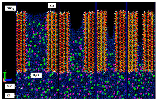 According to molecular dynamics simulation results, the transport of water molecules and ions in C-S-H gel is also influenced by factors such as the Ca/Si ratio, pore size, temperature, and concentration. Ions have a more significant diffusion coefficient in C-S-H gels with a low Ca/Si ratio []. Changes in the nanopore size of C-S-H gel significantly affect the arrangement of water molecules, particularly the structure of surface water molecules. Yang et al. [] constructed four C-S-H gel models with gel pore sizes of 3.5 nm, 2.5 nm, 1.5 nm, and 1.0 nm in NaCl solution. As shown in Figure 5, when the pore size decreases from 3.5 nm to 1 nm, the penetration depth of the solution in the nanochannels decreases, and the transport velocity of Cl− and Na+ is less than that of water molecules when the pore size is less than 2.5 nm. Correspondingly, as the nanopore size increases, the diffusion coefficients of water molecules and ions increase, and the penetration depth also increases [].