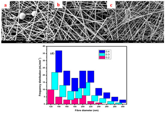 PVA/water, 15 cm tip-to-collector distance, 18 G, 18 kV: (a) flowrate = 0.2 mL/h, (b) flowrate = 0.3 mL/h, (c) flowrate = 0.4 mL/h; (d) frequency distribution.